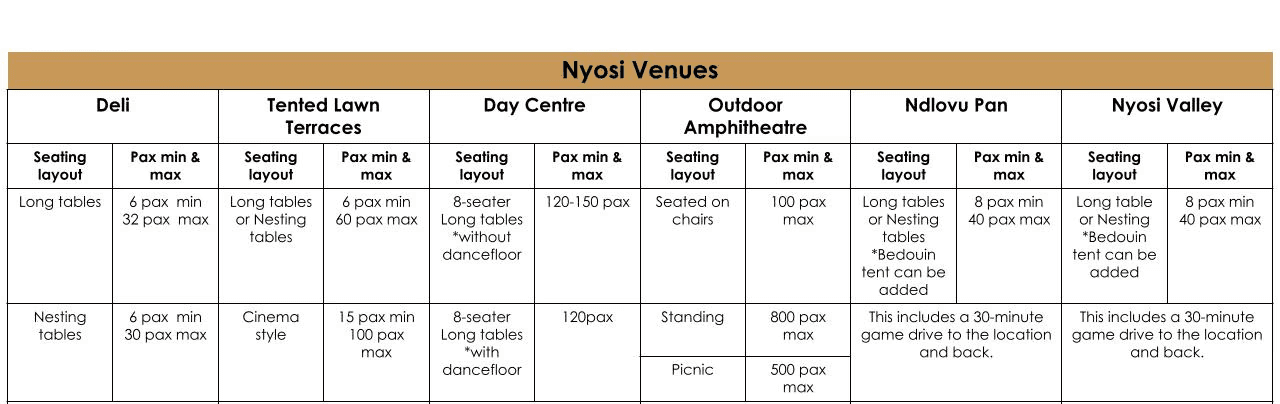 Nestled amidst the lush greenery and thriving wildlife of Nyosi Wildlife Reserve, our event spaces offer a tranquil and picturesque setting for your special occasion. Whether you're planning an automotive industry event, product launch, corporate retreat, conference, wedding or a social celebration, Nyosi provides a unique backdrop that will leave a lasting impression on your guests.